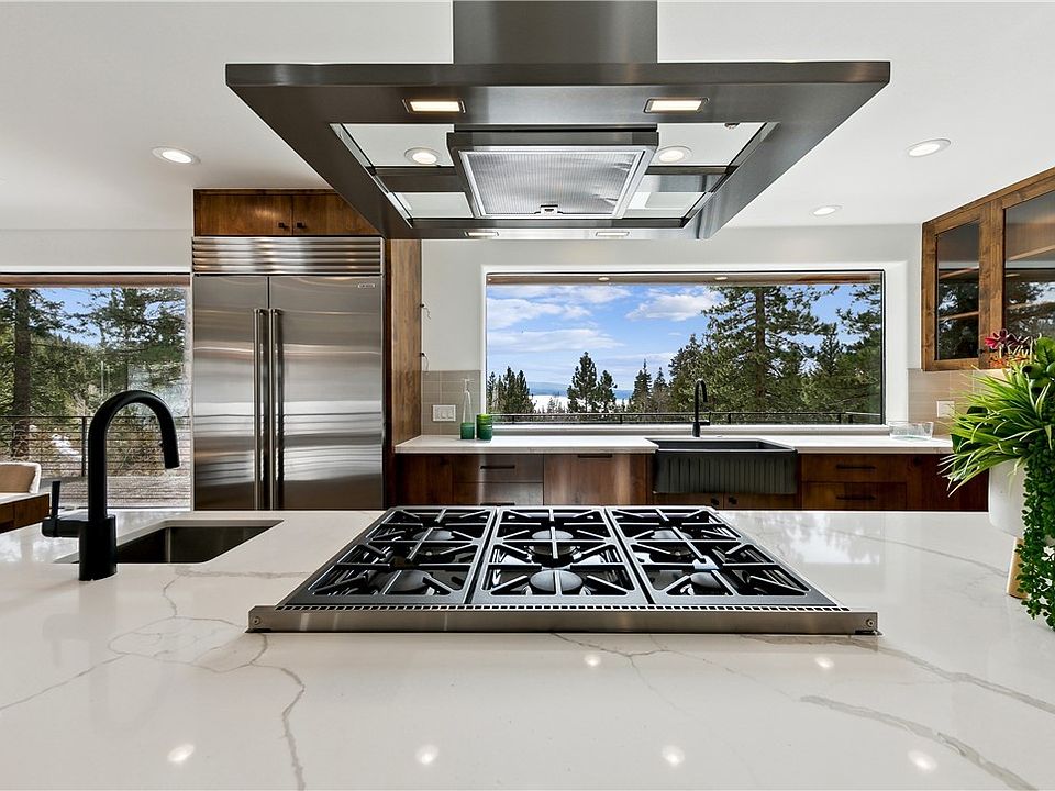 Welcome to a thoughtfully reimagined Lake Tahoe showpiece in Incline Village—where modern refinement meets sweeping lake views. This 4-bedroom, 3.5-bath residence was transformed by the acclaimed Sierra Verde team, who brought sophistication & soul to every detail. Wide-plank DuChâteau floors ground the home in warmth and elegance, flowing through a layout that includes a dramatic great room, a relaxed family room & a versatile bunk room. The luxurious lakeview primary suite offers a private sanctuary with elevated finishes & serene mountain ambiance. The kitchen is both polished and practical, with Wolf and Sub-Zero appliances, quartz surfaces, and a Sub-Zero wine column—equally suited to quiet mornings or lively dinners with friends. Outdoors, the expansive deck invites you to linger, with views of the lake and the hush of surrounding pines. Artful, inviting, and completely move-in ready, this is a rare offering—blending high-end design with the calm, grounded beauty of Tahoe living.
