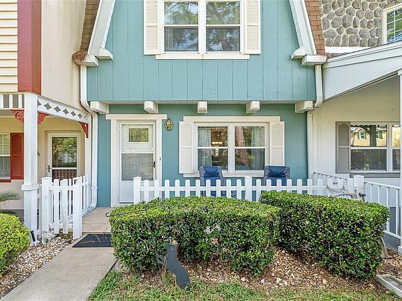 Fully furnished townhouse in the picturesque, European style area of the Americana Village of On Top of the World. This 2-bedroom, 2 and 1/2 bathroom and 2 parking spaces is a must see. Beautiful hardwood floors. Staircase viewed upon entering is finished in hardwood. A beautiful, galley style kitchen boasting wood cabinets with easy close feature. Counters are granite and tile for flooring. Beamed ceiling gives it an added touch! Inside laundry located in closet in the family room. The half bath is conveniently located on the first floor. Two spacious bedrooms and two bathrooms are located on the second floor. Hardwood floors, large closets. Windows replaced in 2021, A/C replaced and in 2018; ceiling fans, window treatments, all add to the quality of this townhouse! The rear of the house has an upgraded Florida room with real windows. Some personal items and pieces are excluded from the sale. Set up your private showing today… On Top of the World is a premier 55+ active adult, golf course community with golfcart accessibility to shops and restaurants.