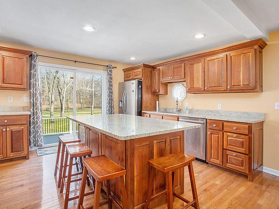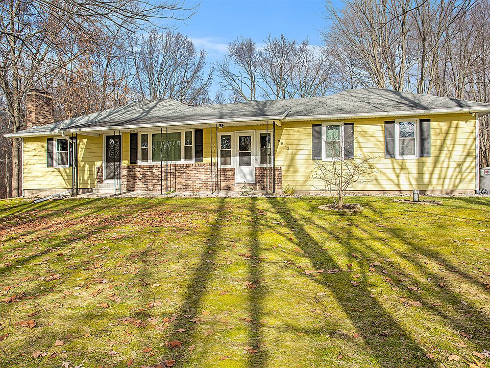 This 4 bedroom 2 bathroom house on 12 beautiful, wooded acres has it all! See the detached 25'x40' garage/barn. Enter through the mudroom to the main floor and take a left to the kitchen. You can't miss the local custom-made cherry cabinets. Through the attached sliding door you can step down to a deck & view to WOW anyone. Off the kitchen, connected by the hardwood floors, is the living area with a wood burning fireplace that makes the ranch just that much more cozy. Tucked to the side is the master bedroom and bathroom. On the right from the mudroom are the 3 pleasantly large bedrooms and another bathroom. Downstairs to the walk-out basement is a great room with a wood burning fireplace, a slider leading to a patio, and the laundry room. The home has an updated furnace and newer windows