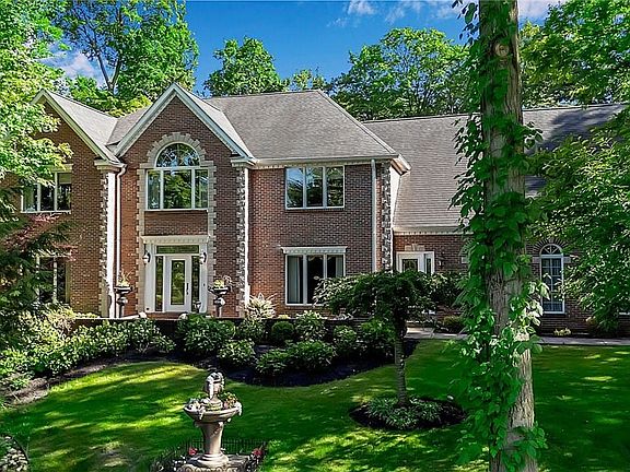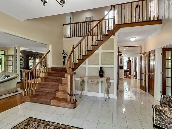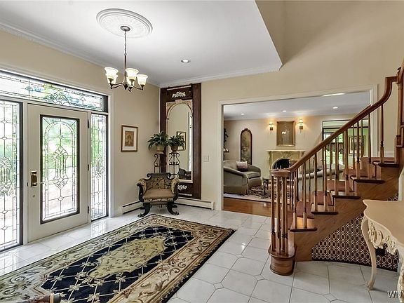 A breathtaking Georgian Colonial set on nearly an acre of private landscaped grounds, located on a beautiful wooded lot on the escarpment. Stunning brick courtyard entrance leads to a custom artisan-designed gate. Dramatic two-story foyer with leaded glass doors, custom millwork and rich hardwood floors are some features throughout. Off the foyer is a sun-drenched formal living room with elegant crown moldings that opens to a formal dining room overlooking the backyard. Solarium with private terrace access offering a tranquil space to unwind. The Chefs Kitchen is a culinary delight; you wont be disappointed with natural cherry and maple cabinetry, granite countertops and premium ss appls, sub-zero refrigerator & Thermador professional range, vented hood system and spacious breakfast nook overlooking a picturesque backyard. 2-story family rm with gas fplc loads of windows, vaulted beamed ceiling and patio doors leading to covered patio. 1st floor also w/1/2 bath, oversized laundry & mudroom rm leading to the 3-car garage. A 2nd staircase leads to a back wing of the 2nd floor. Primary suite is a private sanctuary featuring a tranquil sitting room, gas fplc, spa-like bath w/soaking tub, walk-in California closet plus a secondary closet and private balcony to enjoy the breathtaking views. Second floor includes 4 additional large bdrms with 2 full baths. Partially finished lower level with endless possibilities. Gorgeous backyard retreat with gunite saltwater pool & spa complete with a stone waterfall, charming gazebo surrounded by lush landscaping and manicured gardens, an expansive patio & covered patio with awning perfect for entertaining. Additional features; irrigation system, heated driveway for effortless winters, custom moldings, 6 panel doors, central vac, skylights, and security system and much more. Minutes to premier shopping and fine dining. Top-rated Clarence Schools. Must See!! 2025-09-30