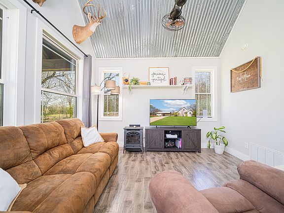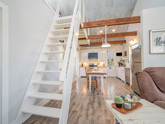 Escape the hustle and settle into serenity with this modern farmhouse cabin nestled on just over an acre in the peaceful Hagansport community. With 1,096 sq ft of thoughtfully designed space, this rustic gem is bursting with character, charm, and opportunity. Step inside to discover 20-foot ceilings with exposed beams, an open-concept layout, and an inviting living space that flows into a stylish, open kitchen — complete with a custom-built farm table included! Whether you're sipping coffee under the wood-framed covered front porch or relaxing in the shaded backyard, this home is built for both comfort and connection.1 spacious downstairs bedroom w walk-in closet, Oversized bathroom w clawfoot tub + separate walk-in shower, Large laundry room w extra storage, Loft space upstairs – perfect for a second bedroom, home office, or creative studio The wraparound steps on the porch make entertaining a breeze, and the view of mature trees in the backyard brings a calming country vibe that’s hard to find. you're looking for a weekend retreat, a full-time residence, or your next Airbnb or VRBO investment, this home offers the best of rural charm and modern comfort.