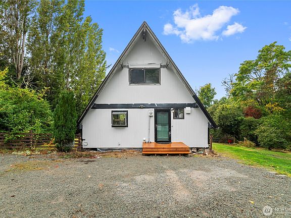 A-frame retreat on Camano Island! Nestled on 1.75 acres across two parcels, this unique home is surrounded by trees for ultimate privacy. Inside, enjoy the open-beam design w/ vaulted ceilings, bright kitchen with garden window, and an open kitchen/great room layout filled with natural light from large windows. An open spindle staircase leads to a cozy loft bedroom, while the main floor offers another bedroom and a full bath. The lower level features a flexible space currently used as a primary suite, plus laundry with ½ bath. Step outside to spacious decks overlooking the yard with fruit trees, greenhouse, and plenty of garden space. Detached garage and shed included. Private setting with room to spread out — Island living at its best!