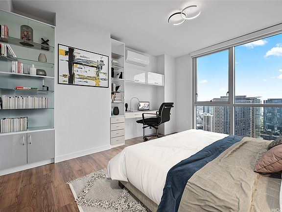 Enjoy Life on the Top Floor! Experience modern urban living in this beautifully upgraded penthouse residence, featuring 9-foot ceilings, luxury vinyl flooring throughout, motorized blinds and custom lighting. The open-concept layout includes a spacious living room, stylish kitchen island with upgraded kitchen backsplash, upgraded bathroom tile and cabinetry, smart toilets, and a custom-built desk and storage system in the primary bedroom. Stay comfortable year-round with split A/C units in every room. Located in the heart of Ward Village, you’re just minutes away from Whole Foods, movie theaters, popular restaurants, and Ala Moana Beach Park. Amenities galore, including a bbq area, recreation and karaoke rooms, conference and theater rooms, outdoor playground, children’s playroom, fitness center, yoga room, and more. Enjoy added convenience with a spacious storage room right down the hall, an additional storage locker on the 3rd floor (same level as your parking), and two full-size, side-by-side parking stalls. Move-in ready—your penthouse lifestyle awaits!