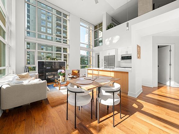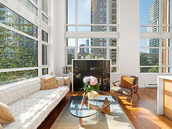 Tribeca Lofts, a boutique Yaletown building. Rarely available, this modern Sundrenched 1,290+ SF 2-level corner loft features 3 bedrooms & 2 full baths. True to the LOFT aesthetic with clean lines, soaring 17FT ceilings & expansive windows, the open layout is ideal for entertaining. Spacious living with gas fireplace, dining, and kitchen with gas cooking flow seamlessly to a covered main floor deck. Light-filled interiors with walnut h/w floors, exposed concrete, and a striking steel staircase lead to the principal bedroom. Generous walk-in closet with custom built-ins & ensuite with natural light. Enjoy access to a 2nd covered deck from this bedroom. Contemporary luxury is enhanced by a full electronics system offering touch-control lighting. Includes 2 parking & a secure storage locker.
