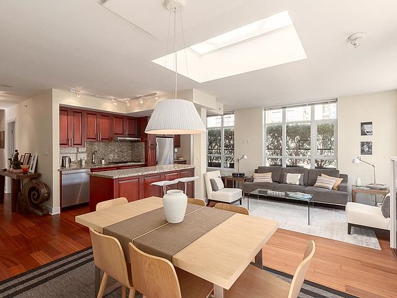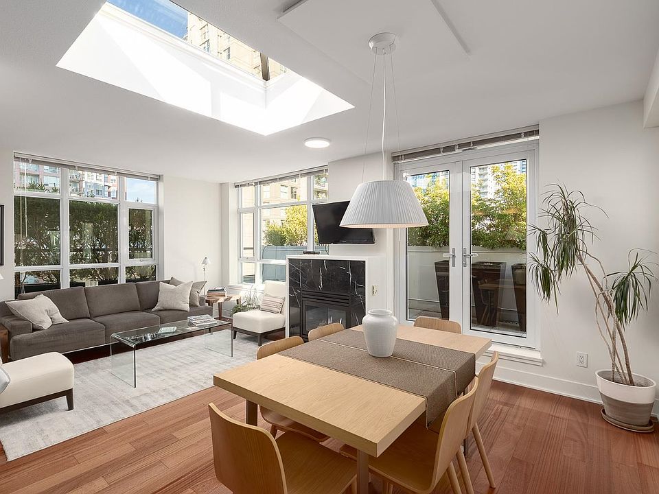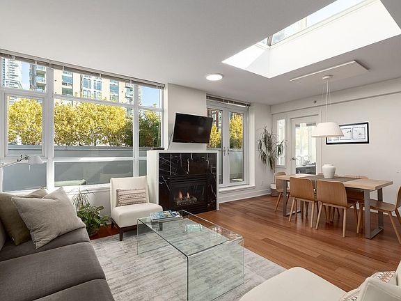 Beautifully appointed stylish city home, TRIBECA. This spacious (2000+sqft of indoor/outdoor space) unique PH suite offers 2 bdrms/2 baths+private office. Open concept living space; great light w/ floor-to-ceiling window on 3 sides; lg functional kitchen w/Bosch appl; beautiful skylight centered over living space; gas FP, hardwood thru out. Step out to a fantastic LARGE TERRACE, infact the outdoor space completely surrounds the unit making it super private. Bdrms are spacious, both with walk-in closets; primary has a lovely ensuite, sep tub/shower. Comes w/ 2 SbyS parking + your own secure storage room. Tribeca is a boutique low-rise New York style building, extremely well managed sitting mid point between DT & Yaletown.This unit is incredibly quiet, private, pristine and move-in ready!