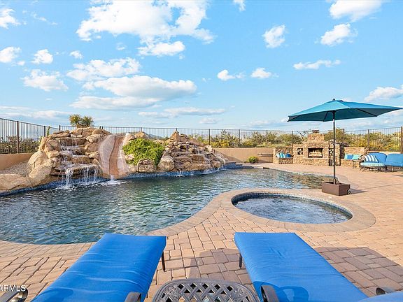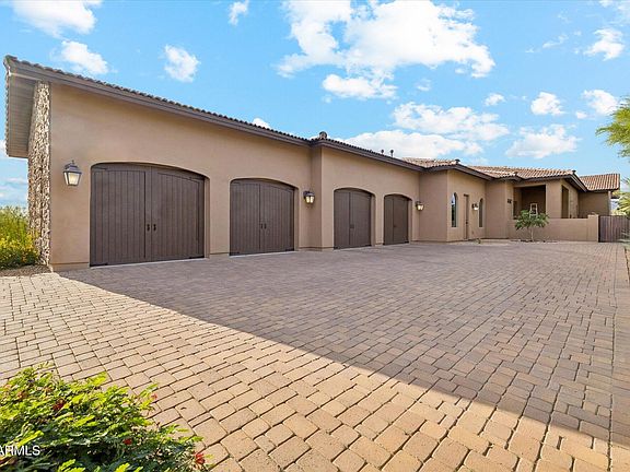 Nestled within the charming gated enclave of Montecito at Mirabel, this stunning 1.10 acre residence with amazing mountain views is an entertainer's dream. A beautiful courtyard entrance and stately wrought-iron doors welcome you into a foyer that wows, revealing spacious open floor plan and views from almost every window. This single-level, zero step home offers a desirable split floor plan with 4bd/5ba. A spacious game room provides addt'l living space and can easily serve as a bonus or flex room. Chef's kitchen features a large island, butler's pantry and a huge walk-in-pantry. Wine cellar plus a wet bar, perfect for entertaining. The spacious four-car garage features premium Husky metal cabinets, offering abundant storage and organization. Outdoor resort style living awaits with a covered patio overlooking a heated saltwater pool and spa that is prewired for solar, includes a pool bath with direct access from the back yard, cozy wood burning fireplace, low-maintenance synthetic grass and mature fruit trees. Every detail reflects the relaxed yet sophisticated Scottsdale lifestyle.