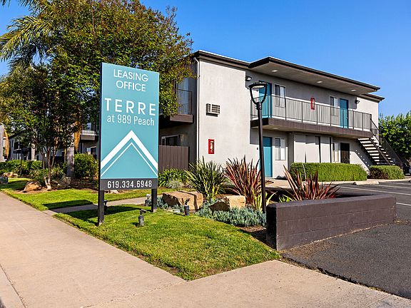 Discover a new standard of living at Terre at 989 Peach, a premier apartment community located in the heart of El Cajon, CA. We offer spacious one- and two-bedroom apartments for rent, each designed with modern comfort and style in mind. Our thoughtfully appointed interiors feature sleek quartz countertops, brand-new stainless steel appliances, stylish shaker-style cabinets, durable wood-like plank flooring, efficient air conditioning, and convenient ceiling fans. Residents can also enjoy our resort-style amenities, including a refreshing swimming pool, dedicated picnic area, and convenient on-site laundry facilities. Our prime location provides unparalleled access to local attractions and essentials. We are conveniently located near top-rated schools, including Naranca Elementary School (0.2 miles) and El Cajon Valley High School (0.6 miles). For shopping and entertainment, you are just a short walk from Chief Auto Center (0.3 miles) and Mollway Shopping Center (0.3 miles), and a quick drive from Parkway Plaza (2.1 miles). Enjoy the outdoors at nearby Hollenbeck Canyon Wildlife Area (3.5 miles) or Wells Park (1.0 mile). Experience the perfect blend of modern amenities and a highly connected location at Terre at 989 Peach