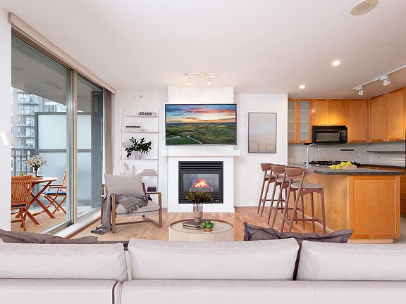 2 BED + DEN Corner unit with 2 BATH in the MONDRIAN by BOSA! Freshly painted & move-in ready with new flooring in the primary bedroom & storage room! Open concept living & dining, with gas fireplace, upgraded hardwood floors & outdoor deck with expansive views of Yaletown. Bright den is perfect for a home office. Spacious Primary Bdrm features a walk-in closet & ensuite. Kitchen features full-size appliances, gas stove, granite counters & breakfast bar. Great Amenities include a full-time caretaker, fully equipped gym, hot tub, sauna, party room, Guest rental suite, visitor parking and secured bike storage with lane access. Enjoy Downtown living at its finest - 99 WALKSCORE - Steps to Yaletown’s best restaurants & entertainment, short walk to Seawall. Move in now!
