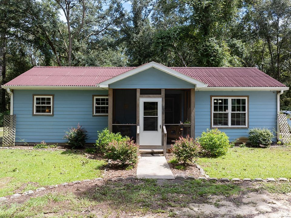Phenomenal opportunity to purchase a high and dry retreat in Live Oak, Florida: Spacious and cozy meet as one in this 2020-built cottage sitting on 2.47 acres. A lovely screened front porch welcomes you into this site-built home with Hardie style siding and corrugated asphalt roof; vaulted ceilings and an open concept make its 978 SF size deceiving, adding great space and atmosphere to the main living/kitchen area and breakfast nook. The kitchen itself features stainless appliances, including an induction cooktop, as well as a stainless farmhouse sink. Butcher block counters and crisp white cabinets accentuate the space, as does the backsplash. The owner’s bedroom features a spacious en suite bath with both a tub and shower for convenience, and a double vanity as well; a second full bathroom allows guests their own space, to go with the Murphy bed in the living area. A second screened porch on the back of the home ensures no shortage of opportunity to relax and connect with the best of nature (minus the bugs!). Internet is available at this property, just a quick ten minutes from town, so there’s no sacrificing conveniences while on retreat, but you’ll still feel worlds away with the great tree buffer surrounding this property. Outdoors, two additional concrete parking pads (11x24 and 11x33) provide a terrific opportunity for storage for boats or recreational vehicles. For those who wish to keep animals, there’s also a great set-up in place to house chickens.