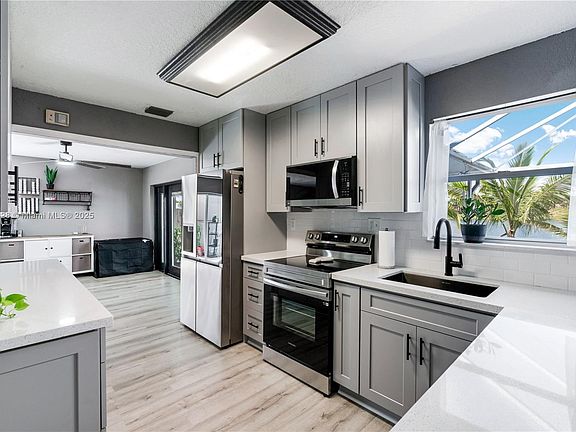 Low maintenance living with expansive lake views! This updated Cutler Bay home offers a new kitchen, new vinyl plank flooring, and a spacious additional room—perfect for a home office. Enjoy indoor-outdoor living with a large screened-in patio overlooking the lake, with stunning sunrise and sunset views. Generously sized bedrooms, updated baths, fresh interior and exterior paint, and a five-year-old roof add to the appeal. New impact garage door. Walking trails, community pool, lawn care included in HOA. Located near the new Publix, Baptist Urgent Care, restaurants, parks, schools, and shopping. Minutes to FL Turnpike, Black Point Marina, walking/biking paths. Golf cart friendly town! Owners Flood policy can be assumed by new owner to save on policy premium.