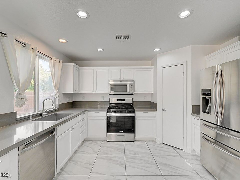 Gorgeous updated 5 BD / 3 BA home with pool in gated southwest Las Vegas community! Open floor plan, high ceilings, designer tile, and modern kitchen with stainless appliances. Downstairs guest suite, spacious primary with spa bath upstairs.Backyard oasis with sparkling pool and covered patio, perfect for entertaining. Near top schools, shopping & freeway access.