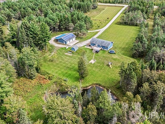 Beautiful, Quiet, and Serene—A True Countryside Retreat Nestled on just over ten acres in Ensign Township, Rapid River, this picturesque property offers tranquility, privacy, and space to roam. The raised ranch-style home, built in 2009, features modern amenities throughout—including central air conditioning and an energy-efficient solar power system that’s integrated into the grid. The main level offers 1,456 square feet of comfortable living space in a desirable split-bedroom layout, providing privacy with two bedrooms and a shared bathroom on one side, and a spacious primary suite on the other. The primary suite includes a well-appointed bathroom with a custom-tiled walk-in shower and an expansive quartz vanity. The heart of the home is the open-concept kitchen, dining, and living area—perfect for everyday living or entertaining. The kitchen boasts quartz countertops, a smart layout, and newer stainless steel appliances. Convenient main-floor laundry adds to the home's functionality. The full basement offers exciting potential for additional living space, with four egress windows already in place for future bedrooms or recreational rooms. Outside, a 42x28 finished detached garage provides ample room for vehicles, tools, and toys, while a 42x10 lean-to off the back offers extra sheltered storage. Two ponds enhance the peaceful setting, creating a haven for nature lovers and outdoor enthusiasts. Whether you're seeking a homestead, a private escape, or a base for adventure, this property delivers the perfect blend of comfort, efficiency, and natural beauty.