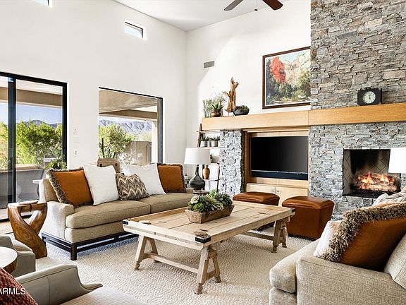 As you enter, you're greeted by soaring ceilings and walls of glass that open up to panoramic views of the mountains, sunsets and surrounding Sonoran Desert landscape. The spacious great room features a striking stone fireplace and leads into a chef-inspired kitchen equipped with top-of-the-line appliances, custom cabinetry, and a large center island—ideal for both cooking and entertaining.