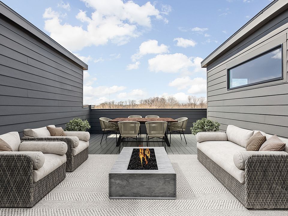 Expansive rooftop deckEnclosed officeFourth-floor wet barSpacious two-car garageBright open-concept layoutPowder bathWalk-in closet