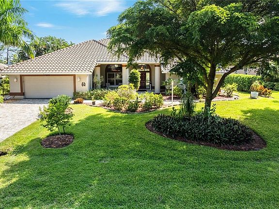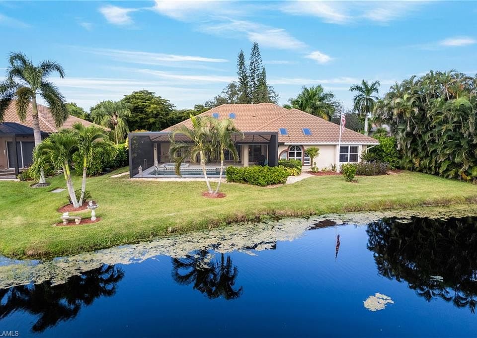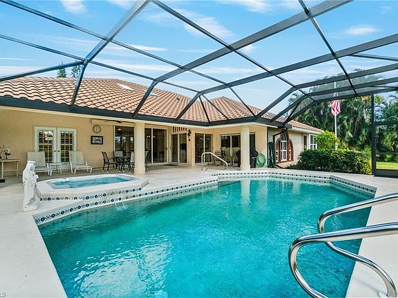 Excellent Floor plan with a Central Kitchen surrounded by a Large Family Room, Formal Living Room, Dining Room, Breakfast Nook, and easy access to a Large 689 sq ft. Covered Lanai for both Indoor and Outdoor Entertaining. This 3 bedroom, 2 bath, Pool Home is located on a Prime Lot offering Privacy and Southeast Views of the Lake and Golf course. The Vaulted Ceilings and Skylights, along with multiple sliders provides an abundance of natural lighting, and the split floor plan offers ideal privacy for guests. For increased safety and security, this house in located in an X-500 Flood Zone where Flood Insurance is Not Required. A New Tile Roof and large Picture Window Screen Enclosure were installed in 2023. Current Homeowners insurance is below $5,000 per year. The 600 sq ft garage has ample room for two passenger vehicles and a golf cart. Spanish Wells Country Club (membership is optional) offers a 27-hole golf course, tennis, fitness, bocce, and a variety of activities. This is an Ideal Location where community amenities, and ease of access to Barefoot Beach, Bonita Beach, RSW airport, Fine and Casual Dining, Coconut Point Mall, Mercato and Waterside Shops makes Living in SWFL a dream of a lifetime. Come see your little piece of paradise for yourself.