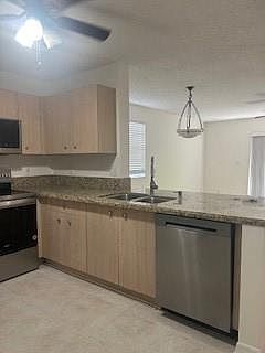 been freshly painted and has brand new appliances with wood and tiled floors throughout. The kitchen is