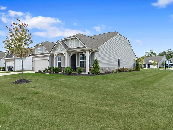 Uncomplicated, carefree living in Estes Park, a low-maintenance community with a small town feel and convenient proximity to everything! Practically new, this 3 bedroom, 2.5 bath ranch blends scale, simplicity and function, with high ceilings, spacious rooms, and abundant natural light. An open concept layout centers on an expansive great room, while the dramatic kitchen makes a statement with its quartz center island, ample cabinetry, large pantry, and breakfast room opening to the covered patio. The split floor plan provides privacy, placing 2 bedrooms at the front, and the en suite primary at the back. Beautiful flooring, distinctive lighting, and an overall sense of style define this home. An oversized, finished garage with an insulated overhead door and thoughtful landscaping further enhance its livability and curb appeal. Community maintenance includes lawn care, snow removal, and irrigation, keeping exterior upkeep effortless. The corner lot enhances the open feel of the home and adds a greater sense of space within a well-kept neighborhood. A home planned for style, efficiency and quiet refinement from front to back.