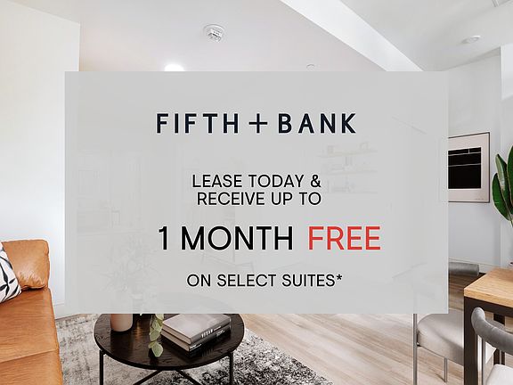 Select suites. Some conditions apply. Prices and specifications subject to change without notice. Errors and Omissions excepted.Premium boutique apartment rentals in the GlebeWelcome to Fifth + Bank!Discover modern living in the heart of Ottawa at Fifth + Bank. Our beautifully designed apartments offer a perfect blend of comfort and style, featuring spacious layouts, contemporary finishes, and an array of amenities to enhance your lifestyle.Apartment Features:Prime Location: Situated in the vibrant Glebe neighborhood, enjoy easy access to shops, restaurants, parks, and public transit.Modern Interiors: Each studio, one, and two-bedroom suite or penthouse suite boasts high-end finishes, stainless steel appliances, and in-suite laundry for your convenience.Amenities: Take advantage of our state-of-the-art fitness center, outdoor courtyard with a BBQ area, pet spa, resident lounge, and a party room with a kitchenette, all designed to cater to your every need.Pet-Friendly: We welcome your furry friends, plus you'll be near parks for their enjoyment.Professional Management: Our dedicated team is committed to providing exceptional service and ensuring a comfortable living experience.Experience the best of urban living at Fifth + Bank. Schedule a tour today and make our community your new home!