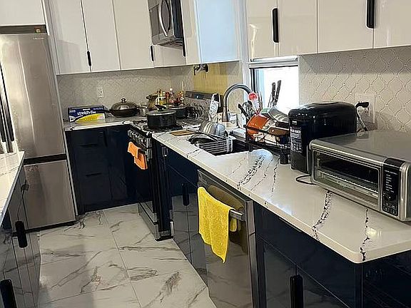 This house was gut renovated and rebuilt by a builder with a luxurious and modern vision in 2024. On the first level you'll find a open concept livingroom and dining area designed with over-sized tiles throughout. The open kitchen boasts a wide-line granite island, beautiful countertops, contrasting cabinets, and all stainless steel appliances. The rear of the first floor has a laundry room, boiler room, and a full bathroom. Second floor designed with hardwood floor consists a total of 3 bedrooms and 2 full bathrooms including the master bedroom with en-suite bath situated towards the rear of house overlooking the decked backyard. House is equipped with modern amenities like stacked washer/dryer, tankless instant hot water, ductless split units A/C, Navien boiler, black metal fence, and flood barrier shields. There's also a private driveway and bi-level garage for additional storage. Taxes are super low. Q11 bus and A train.