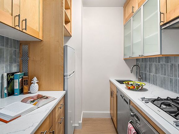 Welcome to 99 Bank Street, 7E, an exquisite studio apartment that embodies the essence of modern West Village living. This recently renovated top-floor, east-facing gem has brand new plank floors, an updated kitchen, and a stylishly renovated bathroom. The kitchen features new quartz countertops, a tasteful tile backsplash, and wood shaker-style cabinetry. It is equipped with appliances from Miele, Gaggenau, and Bosch, perfect for any cooking enthusiast.