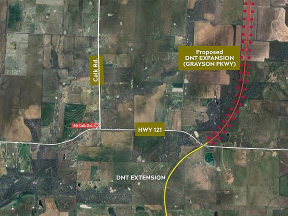 Corner lot on FM 121 and Calk Rd, with over 650 feet of FM 121 frontage, and approximately 1.5 miles from the proposed tollway expansion. Unzoned. Small portion of Northwest corner in flood zone A. Ready for development or buy and hold. Value in land, no value assigned to two houses, outbuildings on property, however Seller did provide disclosures for both properties. 99 Calk Rd built in 1986, 133 Calk Rd built in 1954.