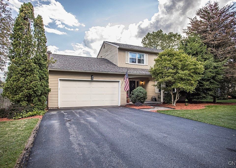 Welcome to 99 Charing Road, a beautifully maintained and well-appointed Colonial nestled at the end of a quiet cul-de-sac in one of DeWitt’s most sought-after neighborhoods. Located within the highly regarded Jamesville-DeWitt School District, this home offers the perfect blend of privacy, comfort, and convenience—just minutes from top-rated schools, major hospitals, shopping centers, and downtown Syracuse. The inviting layout features formal living and dining rooms ideal for entertaining, and a cozy family room centered around a gas fireplace. Sliding doors lead from the family room to a spacious deck with a retractable awning, overlooking a professionally landscaped, tree-lined yard and a stunning heated in-ground pool—creating the perfect setting for relaxation or outdoor gatherings. The adjacent eat-in kitchen includes a gas cooktop and electric wall oven, oak cabinetry, and generous storage and prep space, offering both function and style for everyday living. A finished walkout lower level adds approximately 500 square feet of versatile living space not included in the taxed square footage, ideal for a media room, home office, gym, or playroom, with direct access to the backyard. Upstairs, you’ll find four generously sized bedrooms and two full baths, including a spacious primary suite with a private ensuite, and three additional bedrooms that share a well-appointed hall bath—perfect for family or guests. Natural light fills every room, enhancing the home’s warm and airy atmosphere. Additional highlights include an attached garage, beautifully updated landscaping, and a prime location on a quiet, walkable street. Whether you're hosting, working remotely, or simply enjoying the peaceful surroundings, 99 Charing Road offers a rare combination of space, style, and location in the heart of DeWitt.