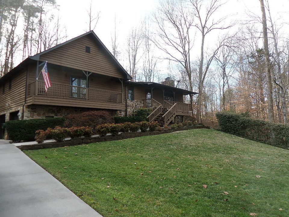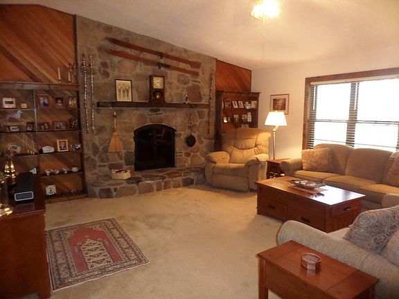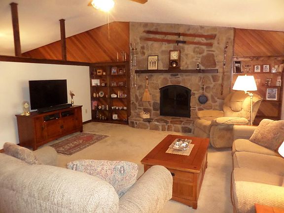 Like living in a cabin in the woods. This lovely home is on a cul de sac lot, with decks across the front and a covered back deck overlooking the woods. Finish the lower level to expand your living area or use it for a great shop area or storage. Features of this charmer include vaulted ceilings, Pella replacement windows, new roof in 2016, Mastershield rain gutters and much more. A massive stone fireplace is the focal point of the living room, which also has solid cedar paneling and a ceiling fan. Open kitchen/dining room is great for entertaining and atrium doors lead from the dining room to the covered deck. Plenty of cabinet and counter space in the kitchen. Two walk in closets in the owner's suite, which has an atrium door to the covered front balcony with a view of the woods.