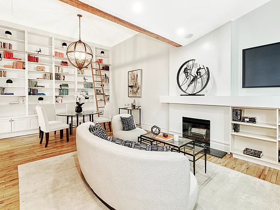 It is hard to miss the imposing stone edifice of this circa 1850 Gothic Church, regally situated in the heart of Brooklyn Heights. Home to 10 unique residences, Apartment #1 is arguably the most desirable of all the units, as it has its own private entrance, making this duplex feel more like a townhouse. The twin oak doors open into a gracious entry hall where architectural detail abounds. To the right, a stone wall abuts the entrance to the the living room, straight ahead a door opens into a spacious powder room/laundry with custom Cole & Son wallpaper and complete with a Bosch stack-able washer/dryer. Forward and around to the left you see a dramatic open curved staircase leading to the second level. On to the living room, you discover a grand room that is a combination living/dining featuring three dramatic architectural elements...a slate framed wood burning fireplace, an Immense stained glass window and an imposing floor to ceiling library wall. The window, facing west, illuminates the space with soft jewel tones, creating a unique sense of calm and beauty. The library wall creates a dramatic backdrop at the opposite end of the room. The fireplace wall pulls the living dining together as one great space. Truly unique,,,truly special! Off the living room is a bright, sunny, windowed galley kitchen with scraped, wide plank oak flooring and first-rate appliances. The winding staircase, with its curved mahogany rail and wide polished treads, ascends past more illuminated jeweled glass to the second level. There you find a balcony area over the staircase, which has been turned into a home office. The two level primary suite, (once the church's choir loft), features the most striking architectural element of the entire home: a great Gothic window which extends from the floor and arches dramatically to the ceiling above. The primary bedroom features three large closets and an en-suite bath with a hint of original hand hewn wood structure and all decked out in custom imported Moroccan tile. A second bedroom features a double height ceiling with jeweled windows atop, large closets and an en-suite bath. Central air throughout. Located in the heart of Brooklyn Heights close to subways, the top schools, shopping, dining, the Promenade, Brooklyn Bridge Park, and a farmer's market down the block - 99 Clinton offers convenient access to everything The Heights has to offer, while also being just minutes away from Downtown Brooklyn.