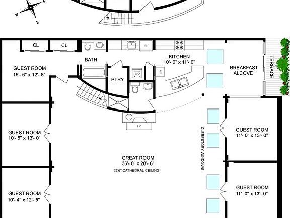 Gas fireplacePrivate terraceModern bathroomsFull-sized washer and dryerCentral air-conditioning zonesHistoric stained glass windowBeamed cathedral ceilings