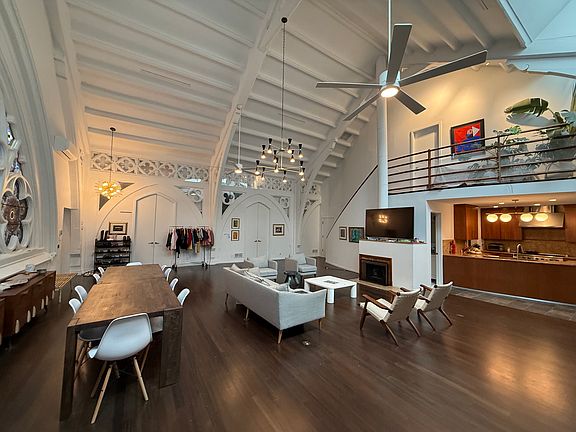 Soaring 23' beamed cathedral ceilings with a huge historic stained glass window creates an expansive feel in this historic church loft apartment, featuring an almost 1,000 sq ft living/dining space centered around a cozy gas fireplace.