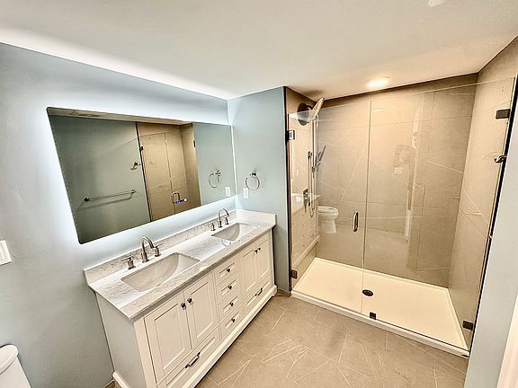 Both bedrooms have closets, and the primary suite includes a spacious closet and a sleek en-suite bathroom with a frameless glass shower. The second bathroom features a smart mirror and extra linen closet storage. You'll also find two large closets in the entry hallway for even more storage space.
