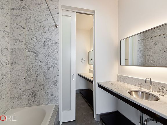 NO FEE AND TWO MONTHS FREE. A true Brooklyn loft, apartment 2D offers a sleeping alcove, a large home office, and measures 988 square feet. This spacious home boasts modern finishes alongside striking original details, an open plan living/dining room, 12-foot high ceiling, exposed structural columns and beams, hardwood flooring throughout and floor-to-ceiling windows. The kitchen features custom glass cabinetry, Bosch stainless steel appliances and marble counter-top and Grohe faucets. The spacious marble bath features Timur tile, Kohler fixtures, and a deep soaking tub. This pet-friendly building, located on the corner of Gold and Front Streets, offers the restaurants, shops and galleries of DUMBO, and the serene retreat and cobblestone streets of Vinegar Hill. Nearby Brooklyn Bridge Park allows for an array of outdoor activities. The close proximity to subway lines and the Brooklyn and Manhattan Bridges provides convenient commuting options. Amenities at 99 Gold Street include a 24-hour attended lobby, live-in super, on-site parking, private storage units, bicycle storage, laundry room, fitness center with a Peloton bike and an indoor basketball court, and a fully furnished rooftop with incredible open views. Listing price reflects net effective rent with one month free on a 12-month lease or two months free on a 24-month lease. Actual rent is $3,775.