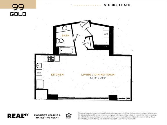 Welcome to 99 Gold, a premier, amenity rich luxury building located where DUMBO meets Vinegar Hill! New to the market is this oversized studio located on the fifth floor with expansive Manhattan skyline views and a spacious private balcony! No broker fee! The Apartment: Each loft-style apartment at 99 Gold Street is thoughtfully designed with a spacious layout and condo quality finishes. With floor to ceiling windows and 12 foot ceilings, light pours into living space and open kitchen, creating a warm and open environment. The kitchens come equipped with marble countertops, and a Bosch stainless steel appliance package, including dishwasher and microwave, as well as a four top range. The open layout offers enough space to comfortably accommodate separate living and sleeping areas. With multiple closets, central heating and air conditioning, and the option of in-unit laundry at no additional cost, we've gone above and beyond to check every box. The Building: Previously a toy factory, 99 Gold is a standout in the area, featuring original details throughout. 99 Gold is home to 87 unique layouts, as well as a plethora of amenities, including a 24-hour door attended lobby, state of the art fitness center with a Peloton bike, Basketball court, Laundry room, Bike parking and a furnished rooftop lounge with sweeping bridge and Manhattan views. Parking and storage also available at an additional cost. The Neighborhood: Located on a scenic tree lined, cobblestone street, 99 Gold is conveniently located where DUMBO meets Vinegar Hill. The neighborhood is famous for its iconic views. From the Brooklyn Bridge views at Main Street Park, to the Manhattan Bridge view on Washington Street, you're constantly reminded of Brooklyn's ever-growing history. Spend your weekend afternoons at the Brooklyn Flea, grab lunch at Time Out Market for some of the borough's best offerings, get a workout in at Brooklyn Bridge Park, and dine in at some of Brooklyn's most renowned restaurants, including Vinegar Hill House, Cecconi's, Cafe Gitane, The River Cafe and Westville. Just three blocks from the F train at York Street and a short distance to A and C trains at High Street. CitiBike station located outside your front door! Contact us today for a showing!