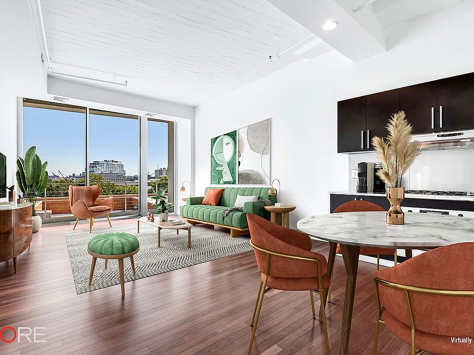 This sprawling one-bedroom at Gold Street Lofts measures 753 square feet and offers fantastic open views and a washer/dryer. Bright and airy, this gracious home boasts modern finishes alongside striking original details, an open plan living/dining room, 12-foot high ceilings, exposed structural columns and beams, hardwood flooring throughout, and floor-to-ceiling windows. The kitchen features custom glass cabinetry, Bosch stainless steel appliances, a marble countertop, and a Grohe faucet. The spacious marble bath features Timur tile, Kohler fixtures, and a deep soaking tub. Located on the corner of Gold and Front Streets, this former loft building offers easy access to the restaurants, shops, and galleries of DUMBO, and the serene retreat and cobblestone streets of Vinegar Hill. Nearby 85-acre Brooklyn Bridge Park hugs the waterfront for an uninterrupted 1.3 miles. Brooklyn hubs such as Empire Stores, Dumbo Heights, and the Navy Yard with a brand new Wegmans are just a few blocks away. Manhattan is one subway stop away on the A/C/F lines and the York Street F station is only three short blocks away. The Brooklyn and Manhattan Bridges allow for quick access to lower Manhattan whether you'd prefer to drive, bike, or saunter over. A Citi Bike station is located directly in front of the building. 99 Gold Street Lofts is a pet-friendly and smoke-free building. Amenities include a 24-hour attended lobby, live-in super, on-site parking, private storage units, bicycle storage, laundry room, fitness center with a Peloton bike and an indoor basketball court, and a fully furnished rooftop with incredible open views.
