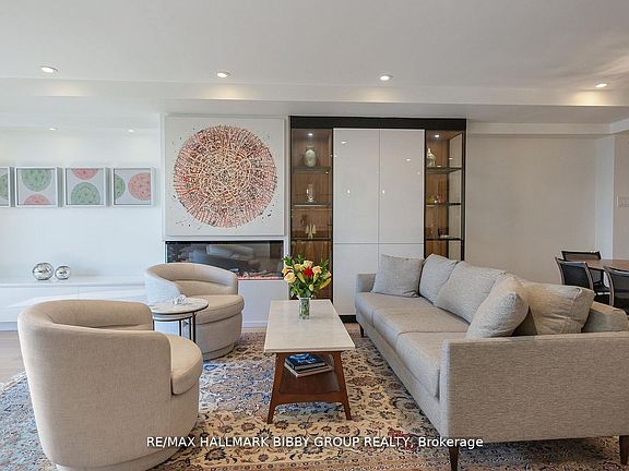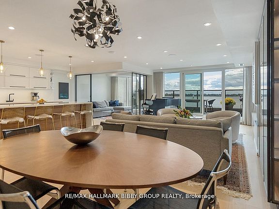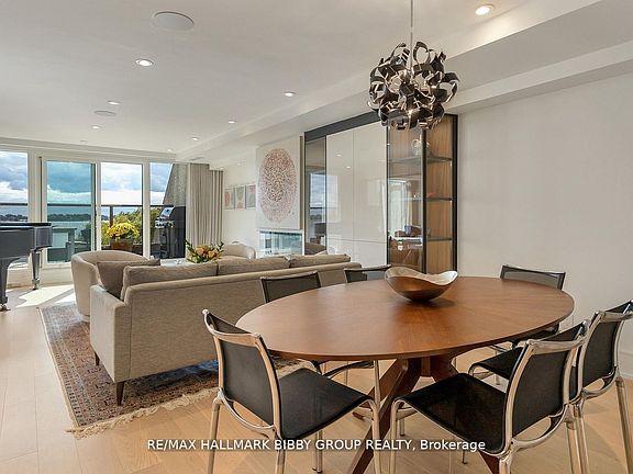 Welcome to your urban cottage in the heart of the city! This stunning 2,000+sq.ft., two-bedroom plus den townhome featured in the Globe & Mail "Home of the Week" offers a rare combination of sophisticated urban design, cottage-country serenity, and an unparalleled lifestyle where culture meets nature. Steps to the waterfront trail, Billy Bishop Airport, streetcar, Union Station, three major grocery stores and the Gardiner Expressway is quickly accessible for easy commuting.With unobstructed lake views from all windows and two sun-drenched, south-facing terraces overlooking Lake Ontario, this meticulously designed residence showcases immaculate attention to detail and superior craftsmanship throughout. As you step through the heated floors of the entrance, floor-to-ceiling windows frame spectacular 180-degree views of Lake Ontario and the Toronto Islands, flooding the space with natural light and offering an ever-changing canvas of water, sky, and sailboats. The residence features new wide-plank white oak flooring throughout, custom millwork, and integrated smart home features including in-ceiling speakers and WiFi.The European-inspired chef's kitchen features top-of-the-line professional-grade appliances and an oversized island with generous seating for four, providing ample storage and preparation space. The open-concept design flows seamlessly from the kitchen to the living and dining areas. The dining space features a built-in temperature-controlled wine storage system, while the living area showcases custom built-ins, thoughtfully placed art niches, and a cozy modern electric fireplace that serves as a focal point for gatherings. The versatile den-enclosed by premium Aladdin trackless glass doors imported from Italy-serves as a sophisticated home office or an intimate media room. A generous 258-sqft terrace extends the living space outdoors, offering the perfect full-width private oasis with jaw-dropping lake views for both sunrise coffee and sunset cocktails.
