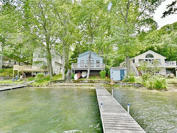 Welcome to the lake! This magnificent home boasts over 2000 SF of living area with STUNNING expansive views!! Gorgeous swimming water, aluminum docks included, storage shed, oversized 2 car detached garage! Plenty of storage under the deck and basement not to mention the loft in the garage! Come relax on your deck overlooking this serene pond!! Lake views throughout most of the home give this the ultimate lake feel. Incredible open living area, with vaulted ceilings, granite kitchen counters, TONS of light, propane fireplace and more! The first floor has a full bath, 2 generous bedrooms, and laundry! As you walk upstairs there is an open office area overlooking the lake, another bedroom and half bath! Master suite features vaulted ceilings, walk in closet, make up area, and full bath! This type of home has been loved and cared for and is ready for a new owner. Phenomenal location, layout and home! Do not let this one pass you by!! Property is on leased land.