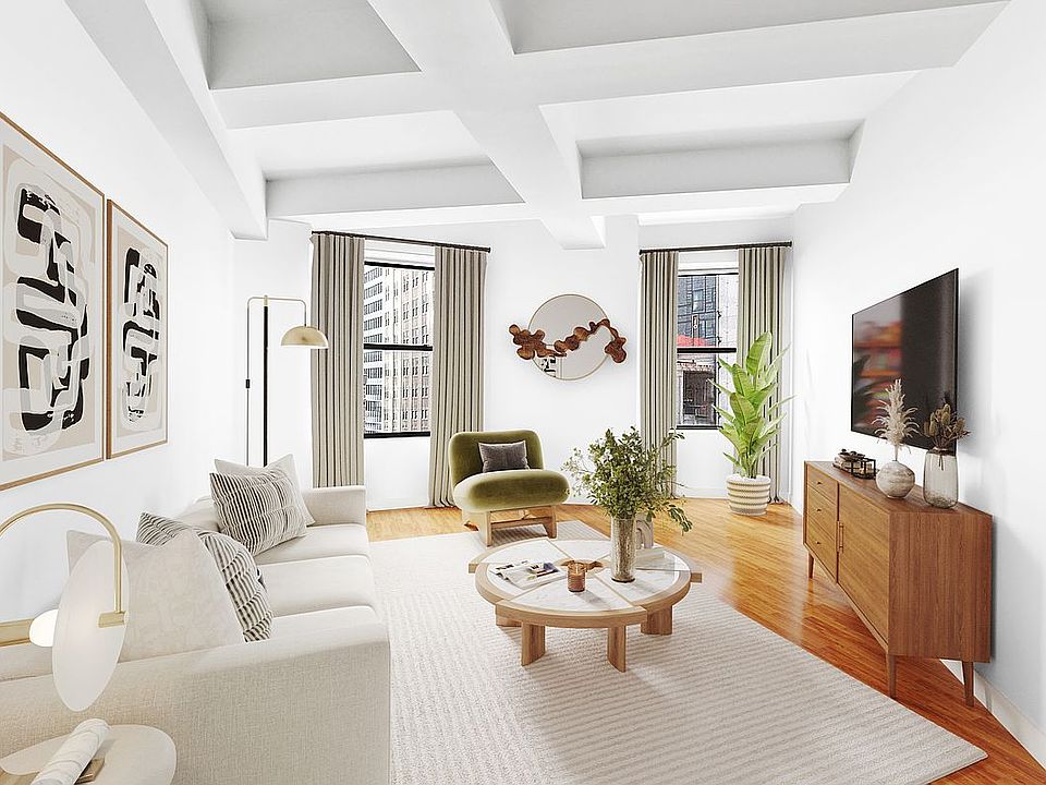 99 John Street | Spacious 1 BD/1BA Loft with Home Office & River Views, 11’+ Beamed Ceilings, Walk-In Closet, and Open Kitchen in a Full-Service, Art Deco Condominium