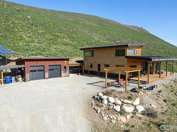 Contemporary Home w Dramatic Views! Experience the epitome of modern living boasting clean, sophisticated lines & an inviting open floor plan. Wall of windows captures mountain panorama. Appealing mix of distinct reclaimed wood cabinets & lg wood beams complemented by innovative finishes. Deluxe Primary Suite on main floor offering luxury & convenience. Custom kitchen equipped w hi-end appliances, perfect for cooking enthusiasts. Comfy 2nd bdrm & generous flex rm. Simplify mountain living w spacious entry & covered breezeway to 2 car garage. Multiple terraces & decks to luxuriate in the quiet life & watch the stars! Adj. 176-acre Meadowlark Trail Conservancy property for trail access & more privacy. Only minutes to Winthrop & Nordic trails.