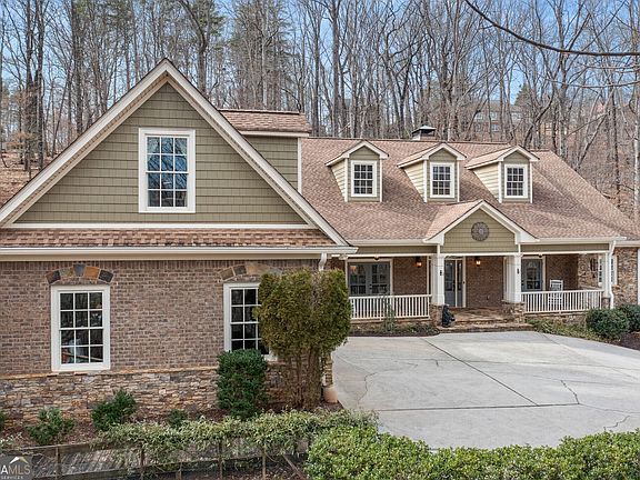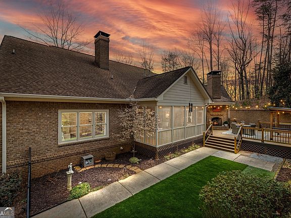 This 3.5 acre estate offers it all- ranch style home with a finished terrace level and a bonus room en-suite tucked away in gated neighborhood and private setting, all just 2.5 miles from Southern Living's top rated town, Dahlonega. Situated at the end of a long driveway, passing a babbling creek that runs along the property, you'll be welcomed home by a stone front porch and three sets of double doors that invite you inside. Inside, every room lends a spacious yet inviting setting to entertain and relax. Trim work adorns every room in the main living areas. Elevated coffered ceilings, stone to ceiling fireplace, and built in book cases create a sophisticated living room and offer a view to the spacious dining room, as well as direct access to the screened in porch for the perfect indoor-outdoor living floor plan. From the screened porch, enjoy the open air dining and grilling near the third fireplace and under the cafe lights, overlooking the courtyard with turf. Just off the living room, the fully renovated kitchen greets you with impressive quartz showcased as a countertop and integrated backsplash. The gas range is framed with glass cabinetry and a custom wood vent hood. This carefully designed kitchen offers convenience and luxury with an abundance of cabinetry and additional pantry storage. From the kitchen, a view of the second stacked stone fireplace brings your attention to the tongue and groove accented ceiling in the keeping room. The main level presents the primary en-suite, along with 4 bedrooms plus an office. The generously sized primary can accommodate a sitting area, and has a private entry to the screened in porch- perfect to enjoy morning coffee. The primary bathroom is sized for luxury and convenience, offering two vanities, a large tiled walk in shower, and a separate tub. The walk in closet features built in custom closet cabinetry. Across from the primary, there's a guest bedroom en-suite that offers private entrance to the front porch. The opposite wing of the main level has an additional 2 bedrooms with a shared en-suite bathroom, and a home office. The upstairs is solely dedicated to the bonus room with a full bath, perfect for guests or a flex space. The terrace level is designed with function in mind. The three car tandem garage is directly accessible from the lower level, along with its own driveway access. A media room is presented in addition to a living room, connected to the kitchenette with a fourth fireplace. Two additional bedrooms and a full bathroom are on the lower level. The central vac system, 5 car garage parking accommodations, ample storage throughout, and its location close to GA-400, Dawsonville and Dahlonega shopping & dining create a seamless blend of convenience and luxury.