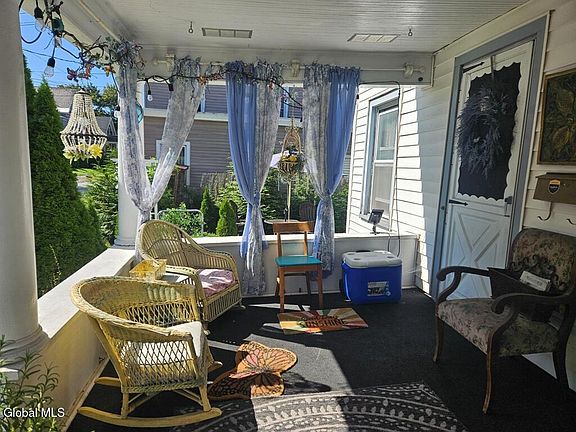 This comfortable home has lots of charm with hardwood floors, lovely woodwork, glass French doors, lots of old style with modern updates. It is currently opened to a one family home, but it does have two kitchens, two electric meters, two front doors, one heating system for both sections if someone wanted it as a two family home. There are solar panels (rented) to reduce electric costs. Relax on the spacious front porch, enjoy the gardens.There is a detached garage. This lovely home is in a nice residential area, but close to town for shopping, close to the thruway and bicycle trails . There is a great walk up attic. The walkout basement seems dry. This is a place you could be proud to call home.