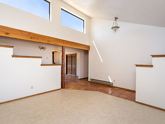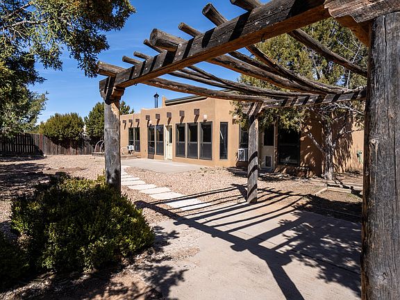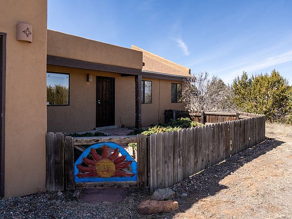 Four bedrooms or 3 bedrooms + bonus room home in El Dorado includes a 400-sf Studio built in 2021 with heat and refrigerated air. A split bedroom floor plan provides privacy and separation for the primary suite. Clearstory windows in the living room provide and abundance of natural light. The open floor plan kitchen, dining and cozy sitting room equipped with a wood burning stove, are the hub of the house. A bank of windows and exterior door provide natural light, views and access to the large fenced backyard. Double doors off the family room lead to a flex room that could be a 4th bedroom, office, craft or exercise room. 2 additional bedrooms share a full bath and the end of the hall. This home is equipped with solar panels and meter as well as electric baseboard heating. For more information on El Dorado, go to www.eldoradosf.org.