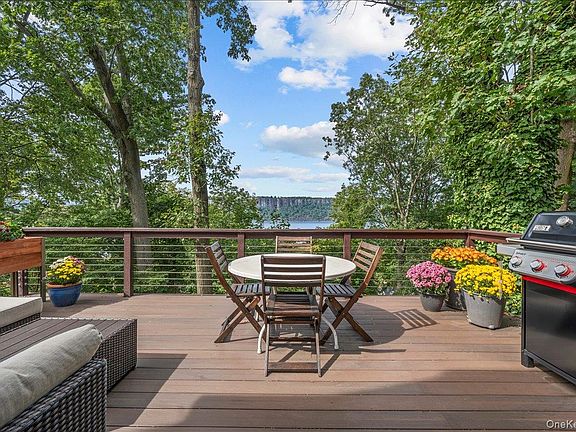 Perched above the Old Croton Aqueduct with picturesque, year-round Hudson River and Palisades views, this serene sanctuary is set on a private and scenic cul-de-sac. From 99 Pinecrest Parkway there are front-row seats to soak in sunset after sunset from a variety of indoor and outdoor spaces starting with the west-facing deck off the back of the house, from the side yard and patio, from three out of the four bedrooms as well as from the cozy, built-in window seat in the living room that frames the Palisades perfectly and happens to be the very first view after entering the inviting, red, front door of the home.