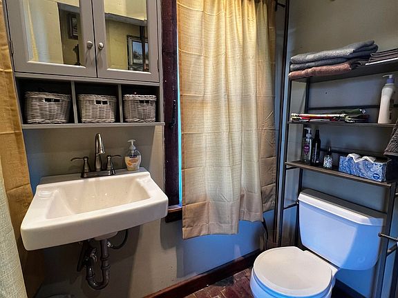This little place is just over the top cute and has so much potential for whatever you would like to do with it! Most recently, it was her 'get a way' so it is currently set up like a studio apartment. Prior to that it has been a coffee shop and a retail spot. The kitchen is set up and I believe previously was licensed as a commercial kitchen. The county says that in the event a business goes back in here, it will need to be re-zoned as commercial since it is currently zoned residential. Heating and air is with a mini split unit that is located in the wall, above the refrigerator. The cute little cabin has a half bathroom, the hot water tank is in a cabinet above the toilet.