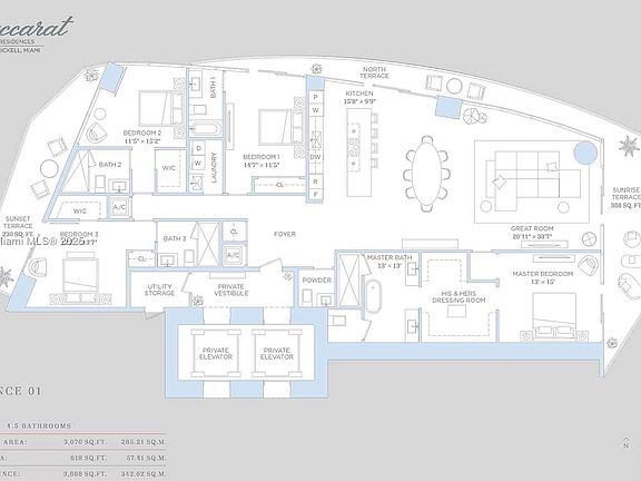 4 BD / 4.5 BA with 3,070 SF +627 SF OF TERRACE. BACCARAT RESIDENCES MIAMI, THE MOST ANTICIPATED LUXURY HIGHRISE IN BRICKELL, OFFERING THIS BEAUTIFUL NE CORNER (THE PREMIUM LINE), EXPERTLY DESIGNED WITH BESPOKE INTERIORS IN THIS FLOW-THROUGH RESIDENCE WITH INFINITE VIEWS OF BISCAYNE BAY, CITY LIGHTS AND THE MIAMI RIVER, DEEP TERRACES, 10 FT. CEILINGS, HIGH END FLOORING, ITALIAN KITCHEN CABINETS, SUB-ZERO/WOLF APPLIANCES, AND MUCH MORE. ELEGANT LOBBY, CAFE, ART GALLERY, WINE CELLAR, MULTIPLE EVENT ROOMS, PRIVATE MARINA, BOARDWALK, BAYFRONT POOL DECK, AND MUCH MORE. PRE-CONSTRUCTION OFFERING - DELIVERY FIRST QUARTER 2028