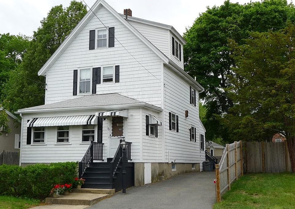 Best deal in Needham!!! Want to build equity and live in Needham? Bring your ideas and view this lovely home on a tree lined side street. Front entry way is a sunny enclosed heated porch can be used as mud room/office space. Dining room boasts two natural wood built-in china cabinets for extra storage. The kitchen has lots of counter space and cabinets and is partially updated. The laundry room is conveniently located just off of the kitchen. A sunny family room completes the first floor. Three bedrooms on the second floor and a full bath. Third floor has two extra bonus rooms with closets can be used for family room and/or office space and a cedar lined closet in the hallway. Hardwood floors and partially carpeted stairs and hallways. A partially fenced spacious level yard has sprinkler system, patio space and a large storage shed for gardening tools and outdoor equipment. OPEN HOUSE SUNDAY JUNE 26 from 12:00 1:00