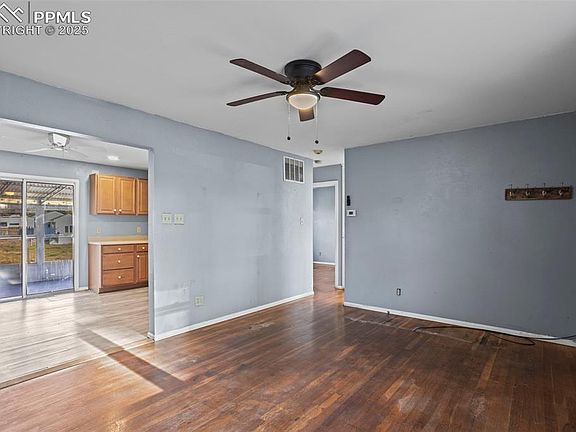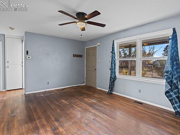 Situated on a spacious one-third-acre lot with convenient alley access, this well-maintained home offers exceptional outdoor space and functional living. The fully fenced backyard includes three storage sheds and an enclosed back porch. Carport parking in addition to the attached one-car garage. A covered front porch with a roll-up sun shade provides a comfortable spot to relax while taking in views of Pikes Peak. Hardwood floors extend throughout the home, complemented by ceiling fans in every room. The eat-in kitchen features newer cabinets and a walkout to the enclosed porch, creating a versatile indoor-outdoor transition. Additional built-in hallway storage and a bathroom with a solid-surface sink and natural light add practicality to the interior layout. Located just minutes from Fort Carson, this property combines generous outdoor amenities with everyday convenience.