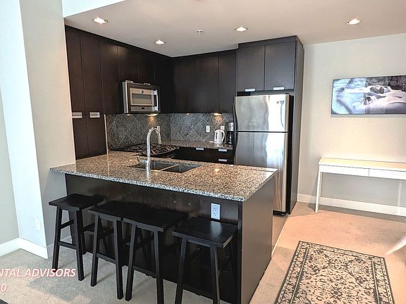 Tile and carpet flooringOversized balconyStainless steel appliancesDark kitchen cabinetryGranite countertopsIn-suite laundryStorage locker