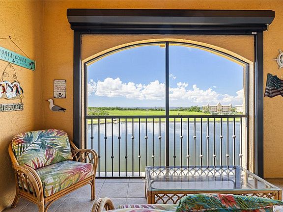 TOP-FLOOR VIVANTE CONDO W/LAKE VIEW & PRIVATE GARAGE - Live like you're on vacation in this 2 bed/2 bath + den unit at Vivante in Punta Gorda Isles. Inside, the open-concept layout blends style and function with tile flooring in the main living areas & wood-look luxury vinyl plank in the bedrooms. Other details include high ceilings and lake views from almost every room. The spacious great room opens directly to the screened, tiled lanai—ideal for enjoying Florida breezes and extending your living space outdoors. The chef-inspired kitchen features Cambria quartz countertops, wood cabinetry, new stainless steel appliances including a convection oven, a corner pantry, built-in recipe desk, and breakfast bar seating. The split-bedroom layout ensures privacy for owners and guests alike. The spacious master suite has walk-out access to the lanai, dual closets (including a large walk-in), and a spa-like master bath with dual sinks, corner soaking tub, and a glass-enclosed walk-in shower. The den/flex space off the main living area can serve as a home office or 3rd bedroom as needed. The interior laundry room includes a new washer & dryer and additional storage. Recent updates include new plantation shutters throughout, Storm Smart hurricane screens on the lanai, and a new metal roof (covered by the HOA). Other amenities include a private, deep 1.5-car garage located under the building with elevator access to your floor. There is plenty of guest parking as well. Vivante is one of Punta Gorda’s few gated condo communities, featuring a 12,000 sq ft clubhouse with a full-service spa, state-of-the-art fitness center, billiards, library, meeting rooms, and a full calendar of social events. Outdoor amenities include two pools—a resort-style pool and separate lap pool, in-ground spa, six Har-Tru tennis courts, fire pit, and plenty of space to relax with friends and neighbors. The 24-hour gate, palm-tree lined streets, and lush tropical landscaping create a truly resort-like experience. Enjoy miles of sidewalks that connect you to all of Punta Gorda Isles and beyond. You're just minutes from Fishermen’s Village, downtown Punta Gorda, the Sunseeker Resort, waterfront parks, marinas, shopping, and dining. Whether you’re looking for low-maintenance luxury or the perfect seasonal escape, this Vivante condo delivers. Make an appointment today—resort living is calling.
