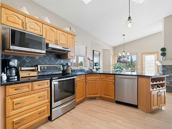 Beautifully maintained 1,682 sq. ft. vaulted walkout bungalow backing onto a natural ravine in desirable Morningside in Citadel. This immaculately maintained home is so versatile featuring 2 bedrooms on the main floor and 2 bedrooms in the basement, with 3 full baths. The living area offers a sunken living room with 14’ vaulted ceilings, skylights, refinished hardwood, and a three-way gas fireplace for maximum functionality and ultimate relaxation.The walkout level includes a wet bar with granite counters, high-efficiency stone surround gas fireplace, and direct access to the landscaped SE backyard. Recent upgrades include new Pex plumbing (2023), hot water tank (2024), Leaf Guard gutters (2024), Lennox high-efficiency modulating furnace with iComfort thermostat (2019), and full interior paint (2023). Additional highlights: cement tile roof, central vac (new with attachments 2025), Hunter Douglas blinds, Bosch dishwasher, two refrigerators, double attached garage, and SunSetter awning with remote. A rare walkout bungalow backing onto a private ravine setting—move-in ready with quality throughout!