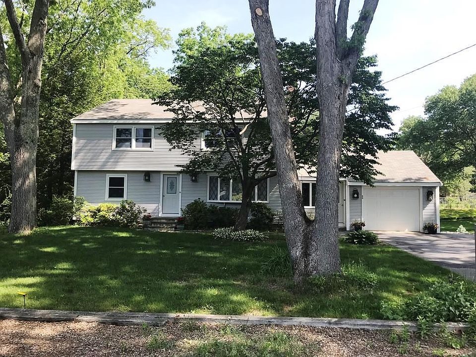 Nine room, five bedroom Garrison Colonial home set on a .63 acre lot. The entry hall leads to a formal living room with a wood burning fireplace.The eat-in kitchen joins the dining room which opens to the great room featuring a cathedral ceiling, skylights, and a wood burning stove. There is direct access to a large deck overlooking the back yard.Two first floor bedrooms and a full bath. Three additional bedrooms and full bath located on the second floor. The side enclosed entrance to the home has direct access to the one car garage. With an additional large two car garage in the rear, under the great room. Mature landscaping, cul-de-sac.